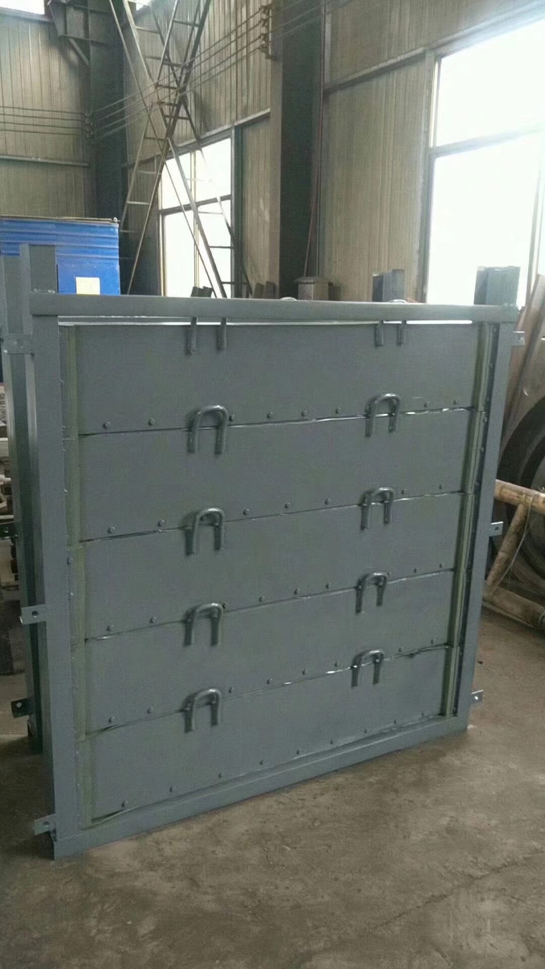 疊梁閘門是使用多塊單獨的閘板,逐塊橫向放入門槽內疊全成一個平面擋水結構。 疊梁閘結構簡單,自重輕、起吊力小,搬運方便,但由于閘板與閘板之間止水靠自重而達到密封的作用,擋水結構的整體性差,靠水位密封差,滲漏量略大于鋼制閘門,故疊梁閘門適用于作臨時擋水或檢修閘門之用。帶預緊裝置的疊梁閘門,在門槽上設一滑道,單塊閘板均順滑道下放,從而防止單根疊梁間的前后左右的錯位。又在疊梁閘門上游兩側,各設一套使疊梁與門槽互相密貼的預緊裝置,提高封水效果,實踐證明帶預緊裝置的疊梁閘門比普通型疊梁閥漏水量顯著減少,疊梁閘門分普通型和帶預緊裝置的疊梁閘兩種。疊梁閘吊運采用特制的抓落機構,就位正確,動作靈敏,操縱方便,受到眾多客戶的歡迎。